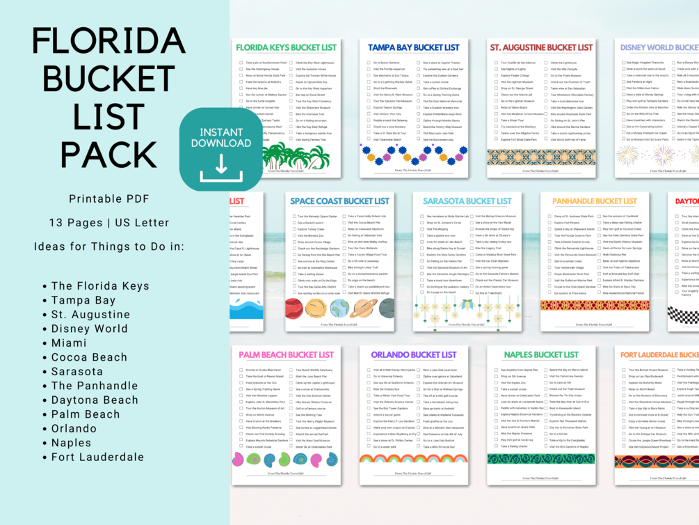 Includes 16 bucket lists that are downloadable and printable! Discover things to do in Florida for each of the following areas: